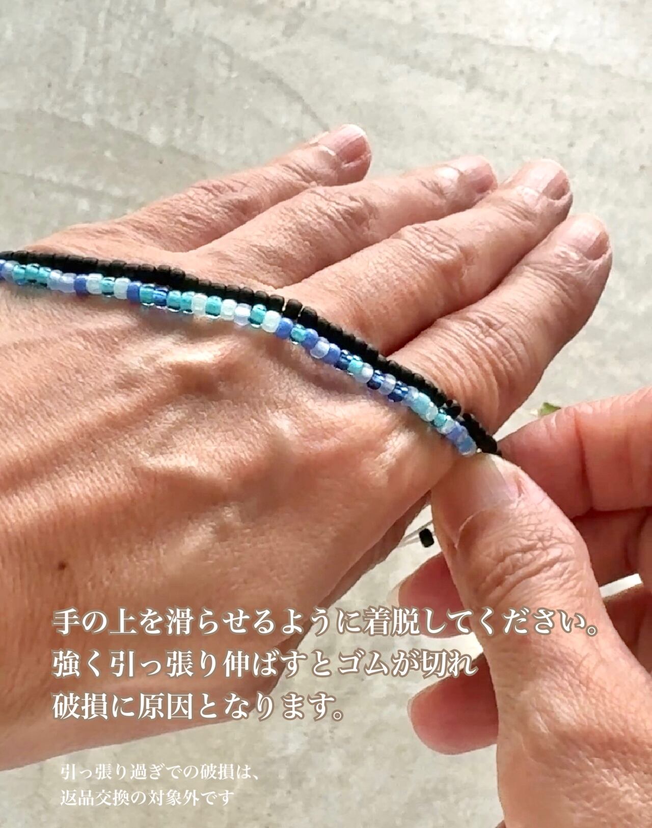 ご使用の際は、引っ張って広げず、腕の上を滑らせ転がす感じでご着脱いただきますようお願いいたします。