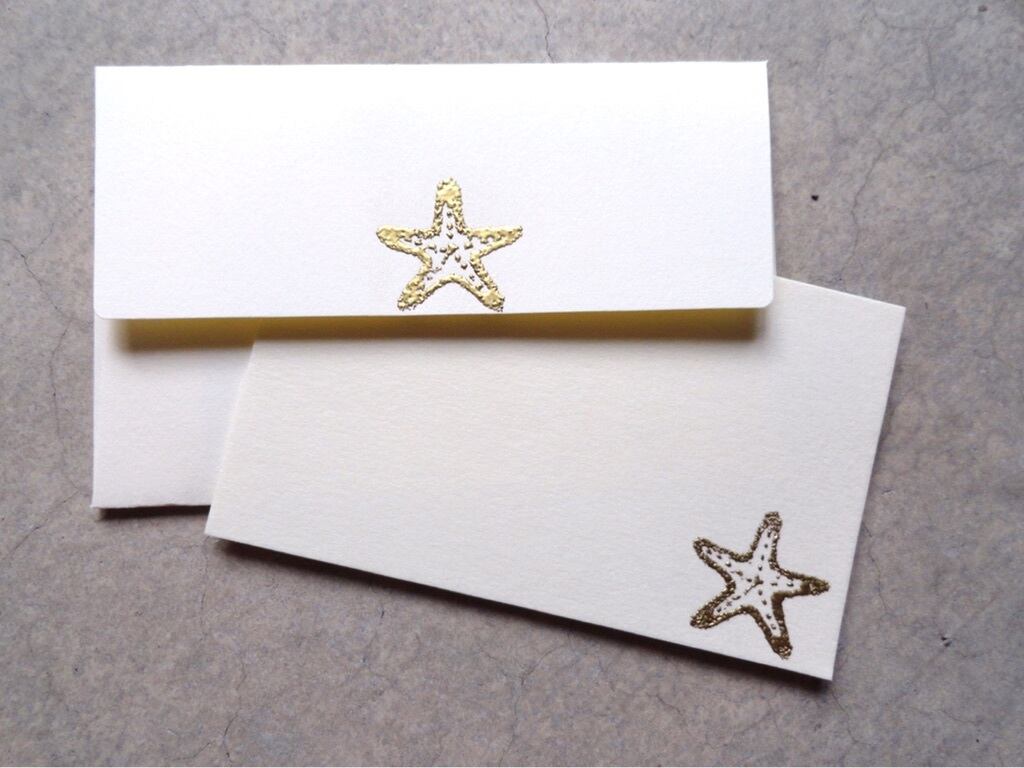 カードと封筒にヒトデ、二枚貝、巻貝、モンステラ、プルメリアを一つ一つ丁寧にゴールドでエンボス加工でで施しました。デザインはもちろんPeaceful Smileのオリジナル。素敵なカードに仕上がりました。在庫の数が足りない場合は、リクエストしていただきましたら、すぐに受注製作いたしますので、お問い合わせください。(1セットからお受けします)写真は、組み合わせ全てを載せきれていませんが、全部で8組あわせあります。