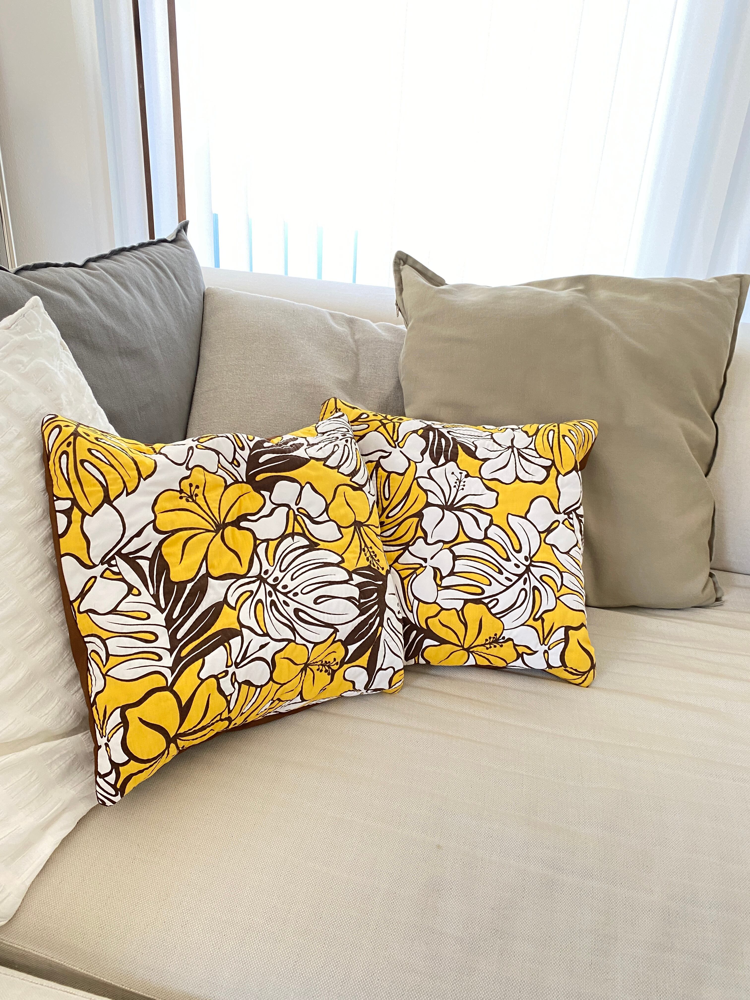 今回のデザインは、大胆にハワイアンプランツが配置された色合いもこげ茶、白、黄色の3色だけというシンプルさ!そこにPeaceful Smileのハンドキルティングのぷくぷく感が合わさって、かっこよさの中に温かみのあるおしゃれなハワイアンテイストに仕上がりました。(ハワイアンデザインを縁取るようにキルティングを施し、デザインをふくっらとより際立たせています。)クッションの入れ口は、表のハワイアンデザインに使用している黄色と同じ色合いの糸でステッチを施しました。見えない裏側にもさりげないこだわりです。