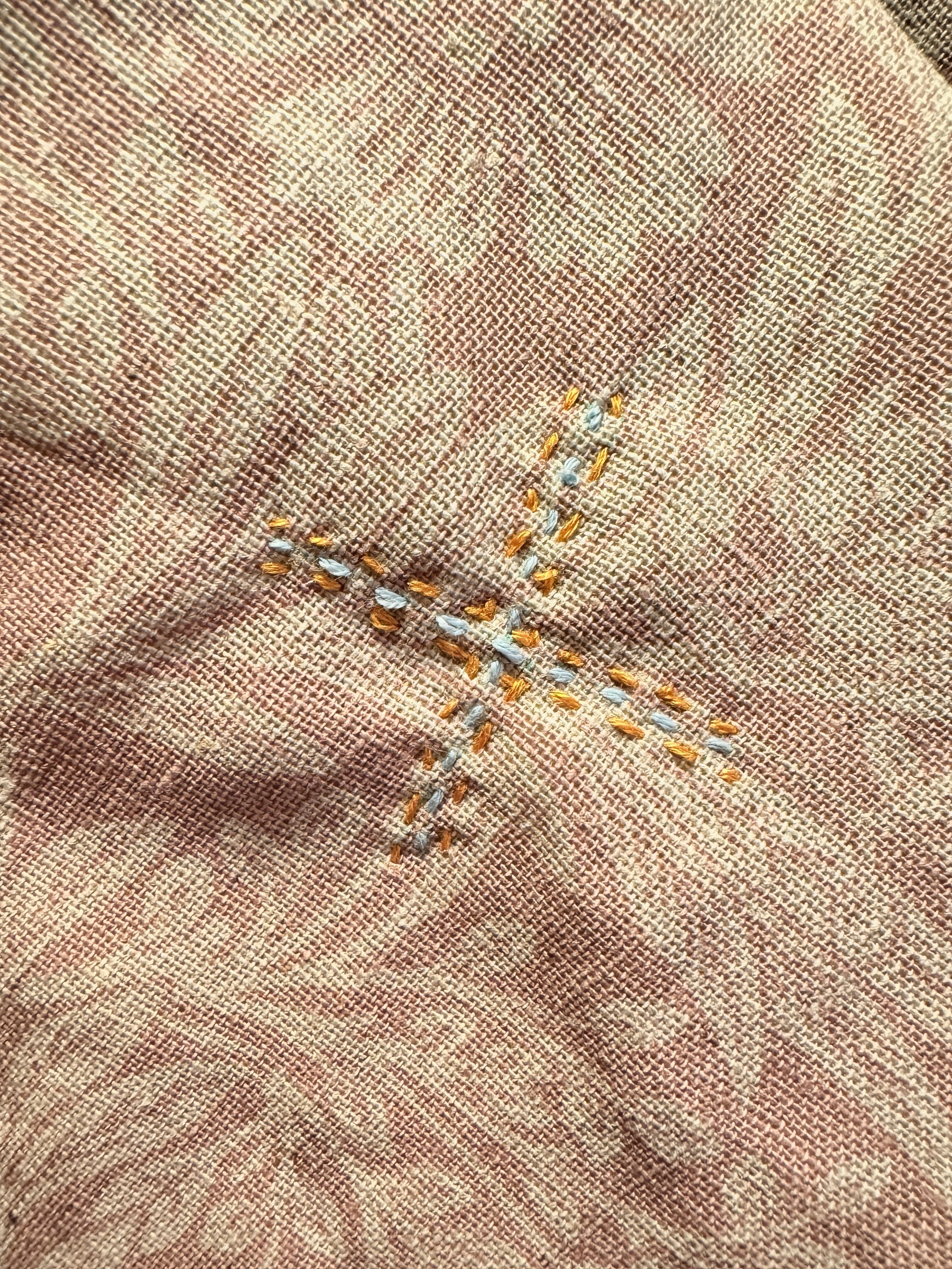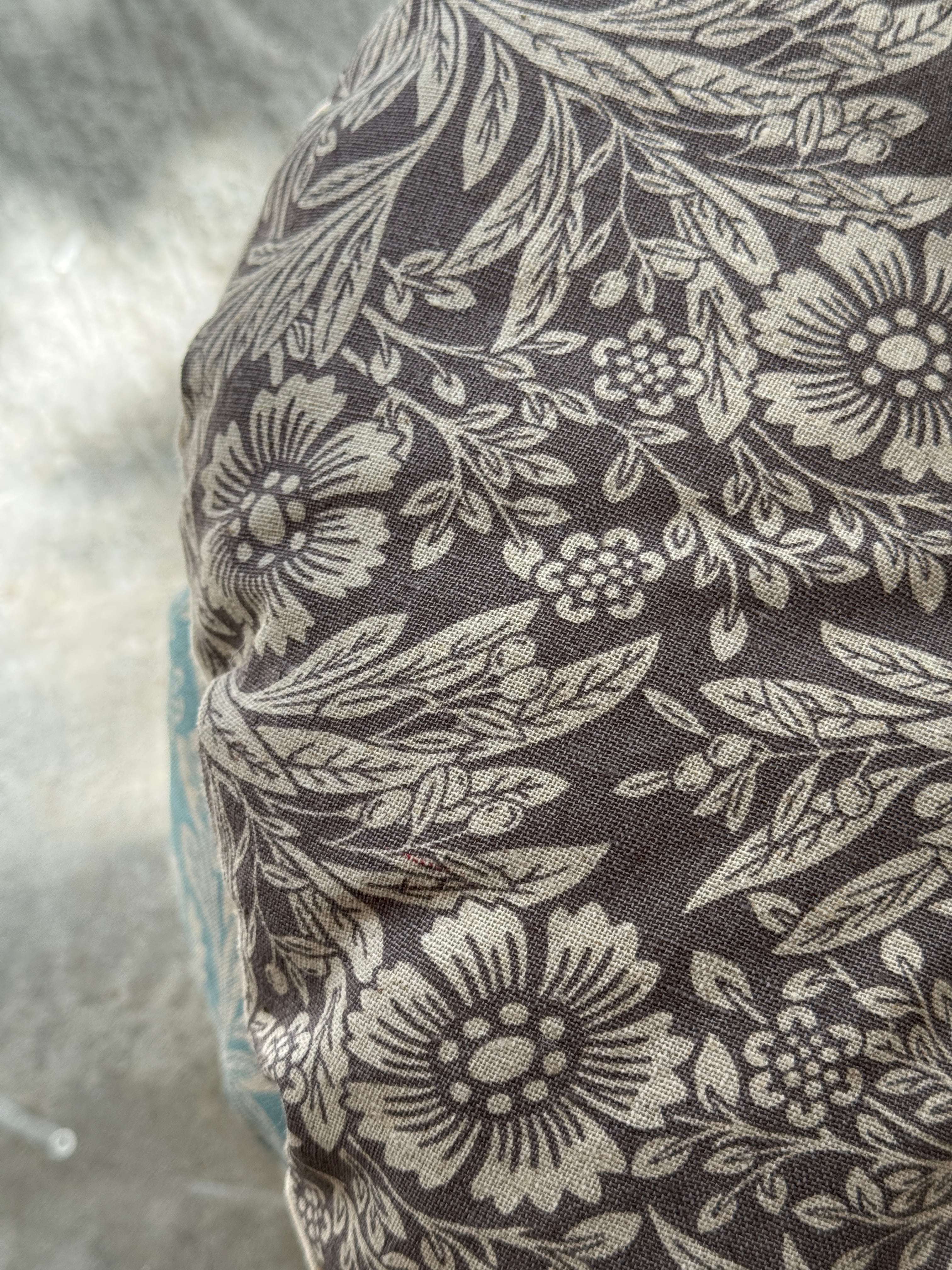 柄のある布とシンプルな生成りの布で作ってあるので、気分に合わせて使い分けできて便利です。中央部分にはそれぞれの布の色に合わせた糸を使いハンドステッチで久窪みをつけてあります。