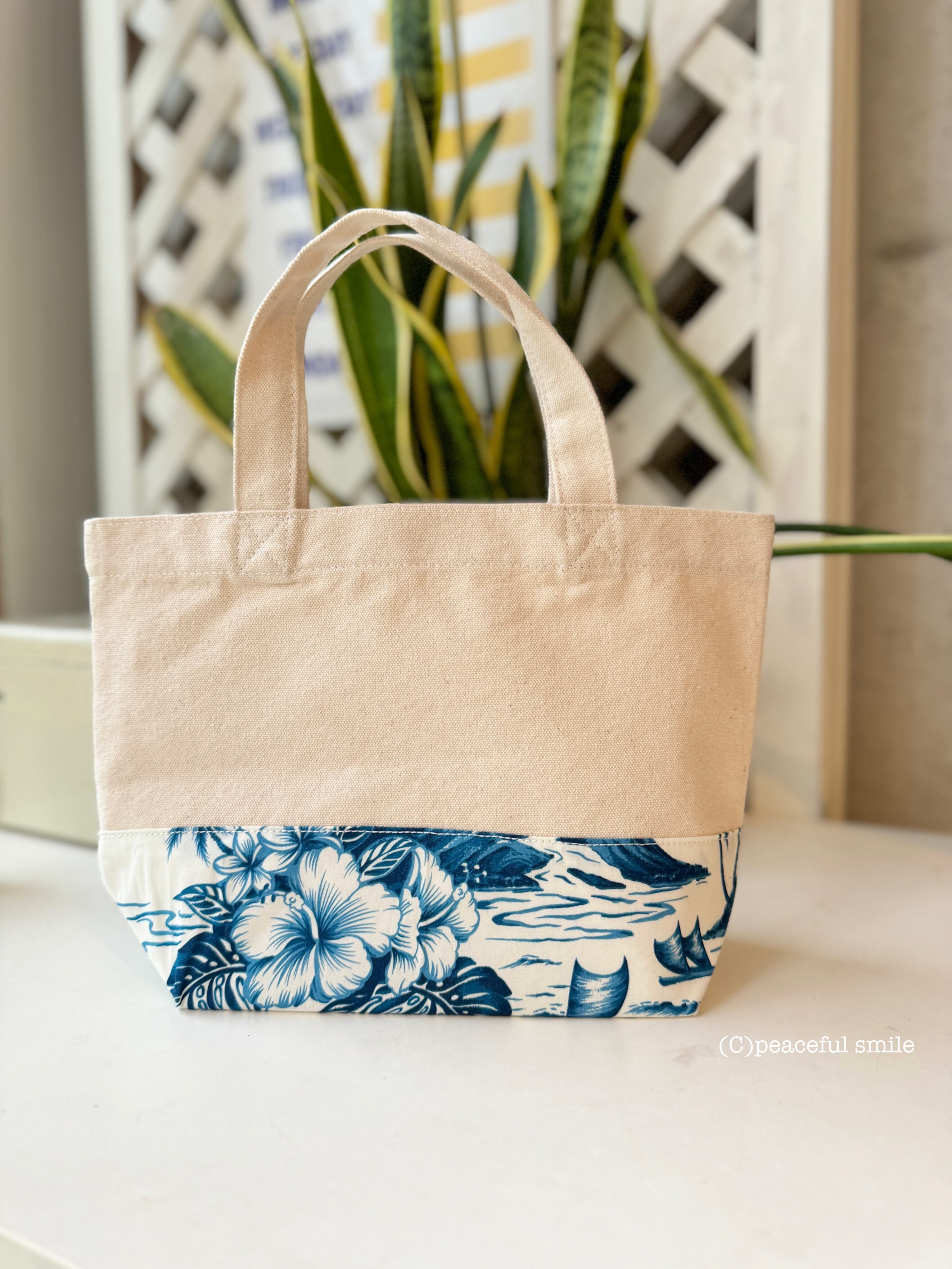 レトロなハワイアンファブリックをまとったかっこいい小さめトートバッグが出来上がりました。